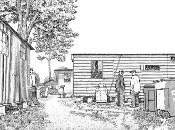 west virginiaEach chapter is an article written by Hedges, documenting their travels to a particular site. Locals are interviewed and are the subjects of most of Sacco’s illustrations in the book (his work is typically either a landscape for an area, or a person talking of their experiences.) Within this format, Hedges makes invaluable use of his time as a foreign correspondent, drawing on that experience to show how these regions are being treated much the same as third-world countries under foreign occupations, domestic dictatorships, or the suffocating yoke of international debt. This is contrasted with his written descriptions (and Sacco’s visuals) of the people who inhabit these areas: most are simple people whose definitions are blurred, sometimes completely overtaken by the hardship around them. Hedges and Sacco point out strength and sacrifice in those they interview, as much as they profile individuals who, understandably, in the words of Hedges, are “living lives in which tenderness and security are grabbed in desperate snatches.”