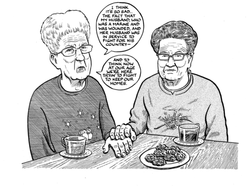 immokaleeBut what I find intriguing about Days of Destruction, Days of Revolt is the way I see their previous work illuminate these pages to reveal a truly devastating picture of the state of America. Hedges draws on a treasure trove of historical events he has personally witnessed or painstakingly researched to show how the elite of the U.S.A. may not be as invincible as they think; Sacco’s trademark illustrations immediately recollect visions of a street in Gaza—and yet, I’m not looking at a street in Gaza here; I’m looking at a street in Camden New Jersey or Immokalee, Florida.
