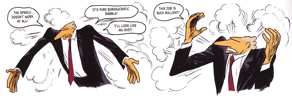 Aesthetically, the comic is enchanting. For a story about civil servants it flows with marvelous action – dropping, running, drinking and above all gesticulating wildly. The reader may be forgiven for feeling it owes something to the aesthetic of Tintin. The author devotes a page and a half of de Vorms’ dialogue to praising Tintin as flowing, beautiful poetry. The homage is both explicit in the text and implicit in the style, making action out of a torpid subject. Above the narrative looms de Vorms, large as the rocket ship that took Tintin to the moon.
