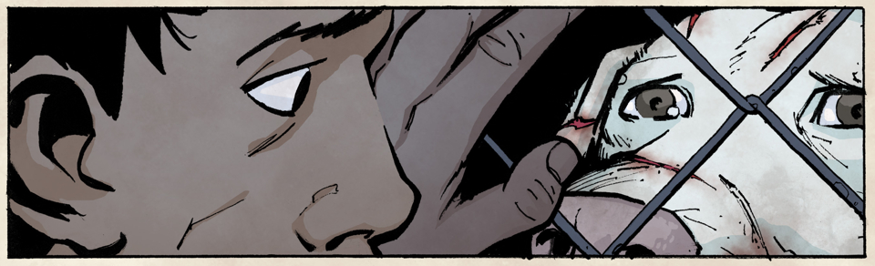 The result is visually stunning. The dramatic dark areas remind me of the chiaroscuro of Eric Drooker’s Flood, the compositions remind me of Peter Kuper’s Franz Kafka adaptations. He seems to have looked at the whole field of graphic novels and incorporated the best of what we have produced, and we should all be honored by our participation in his project.