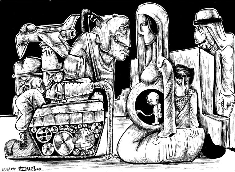 Mohammad says that the first artwork he was aware of were the drawings of Palestinian political cartoonist Naji Al-Ali. His mother showed him those pictures to teach him Palestinian history. Naji Al-Ali’s sparse, fine lined drawings were ideal for a third world press where ink itself might be in short supply. Naji could sum up complex conflicts in one small image, with just a couple of symbols or figures, expressing politics with passion and poetry. Naji was assassinated in the 1980s and is viewed by many as a martyr. So it’s not surprising that Mohammad began his career as a newspaper illustrator following in the footsteps of Naji Al-Ali.