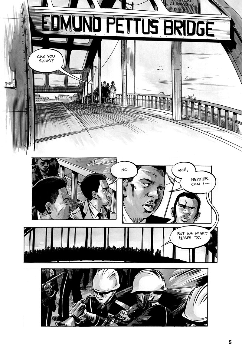 I’m excited about what I’ve seen so far–this is an often raw, ugly–yet true history of the Civil Rights Movement in the United States. To get a glimpse of this, I’ve asked the kind folks at Top Shelf to show you the first five pages of March. I hope you see what I mean–and be sure to pick up a copy when you get the chance!
