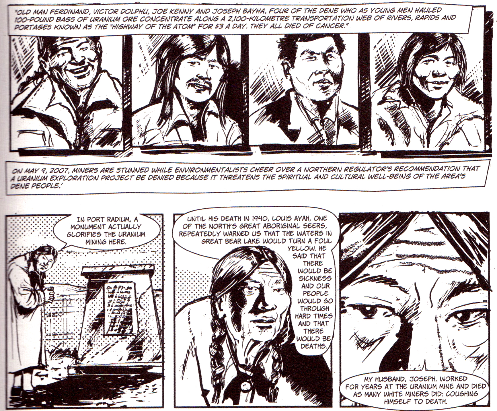 All of these stories are relavent to Canadian politics. ‘Uranium’ and ‘Oil’ get extra points for establishing a strong historical context at the beginning of the comic–the reader feels less like they’re just being dropped in on a subject that they know nothing about. (In their own ways, both also include the history of the pre-Columbian Indigenous relationship to the resource: their material use or, in the instance of uranium, its toxic effects.)