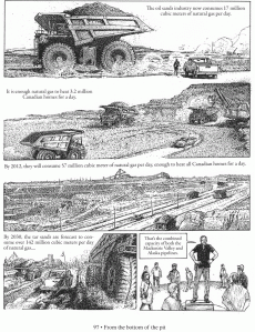 The real winner of this story is Phil Angers’ artwork. Some of the pages here are really detailed and impressive (Not all–the characatures of ducks and bears at the end kind of escapes me). It’s hard to depict a project as big as the Tar Sands, but I think you get a better picture with this comic than you would with only text, and that’s a major goal with political comics: through the medium, you bring out a something of a new dimension to the issue.
