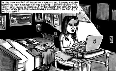 The artwork is straightforward, using a more casual, bubbly style than a lot of serious comics out there. Not a lot of symbolism or figurative illustration happening here. On first glance as a reader, it feels so first-person that it makes me think that maybe this was, along with the story, the work of Dawn over the course of her trip. The style of the quotations is inconsistent, also like a first-person narrative. Some dialogue seems to have been made up on the spot, where other pieces are probably verbatim from a voice recorder (like the history of GoldCorp in the area and other highly detailed information).