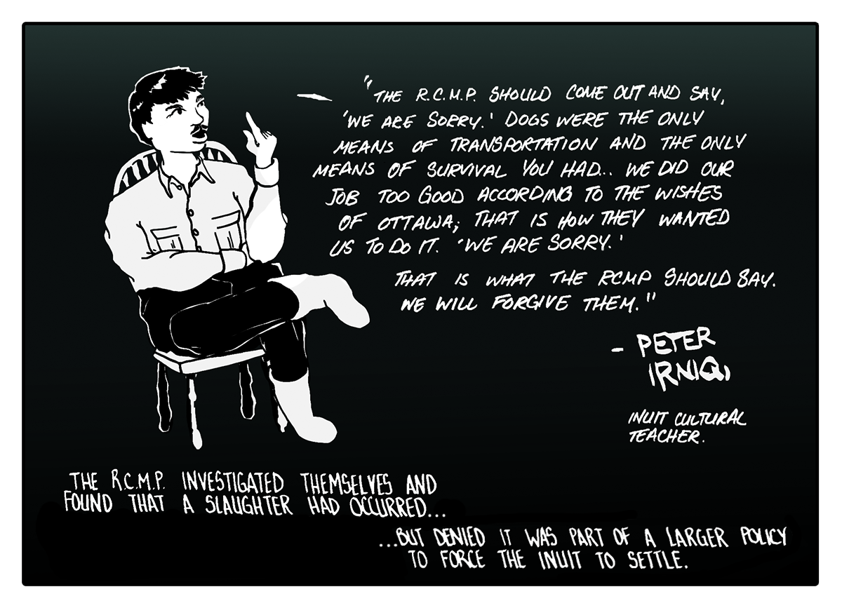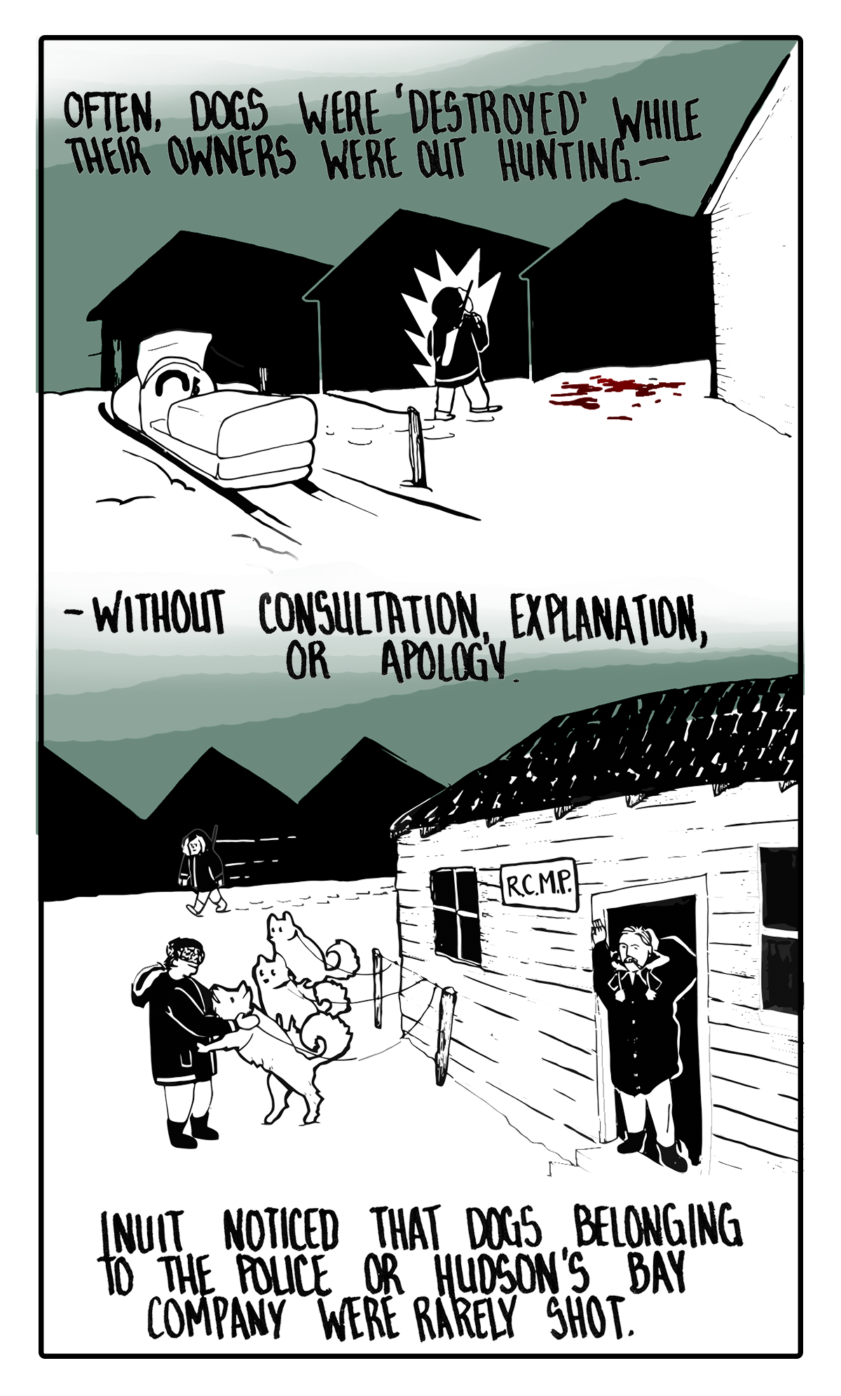 Ultimately, the reasons we did it are close to the reasons for our concern. This story badly needs amplifying. It is part of the larger story of the genocide of indigenous peoples carried out by the Canadian state, but it is not so well known as the violence of the residential schools system. We hope this comic can be a starting point to help settlers find more substantial lines of inquiry and in doing so, reach a broader audience than the Qikiqtani Truth Commission has yet done.
