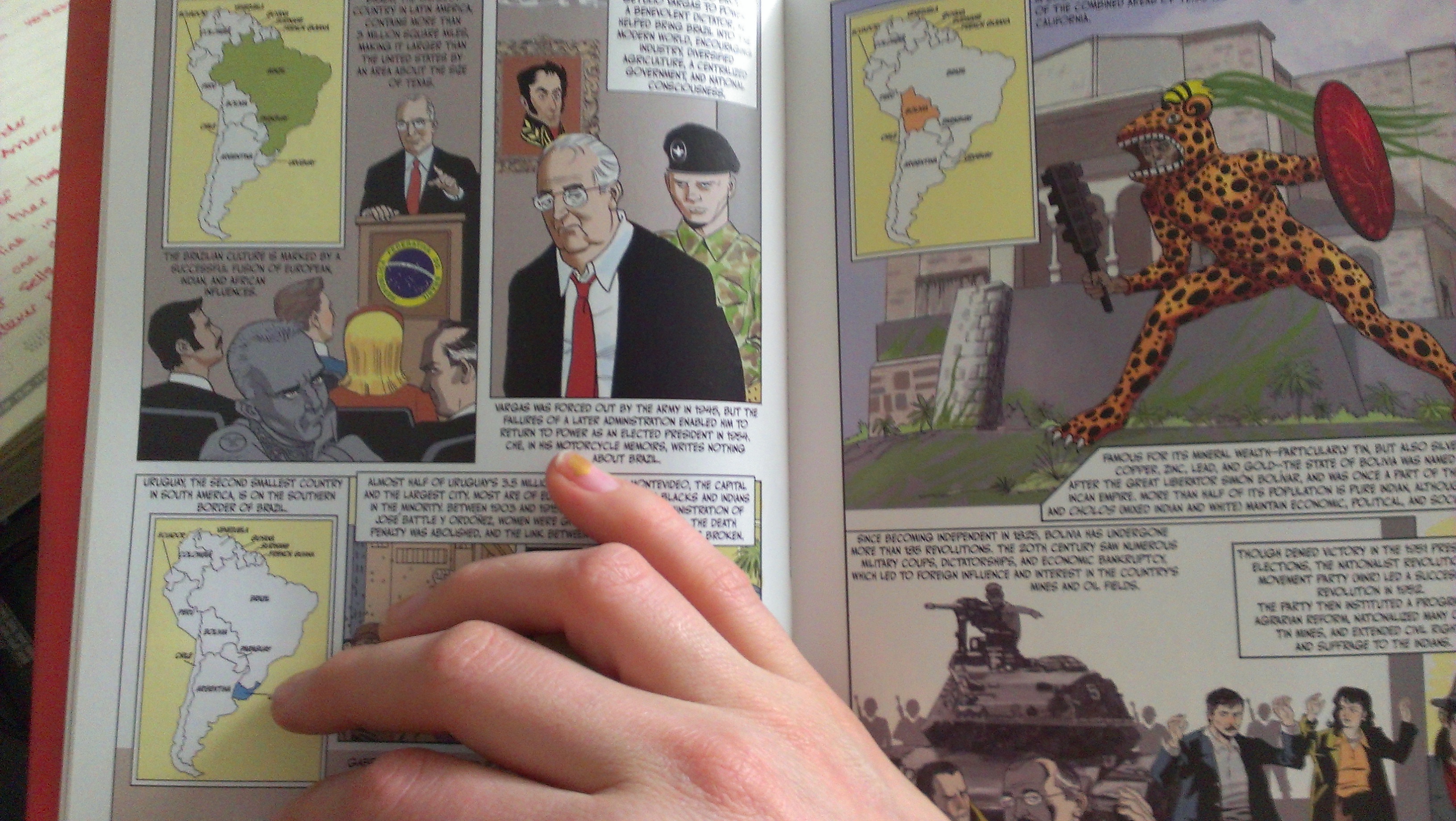 IMAG0381A plus is that the book takes the time to illustrate the political climate, more or less, of the major Latin American states at the time of Che’s trip, which I find useful and original—yet even this unique portion of the book tends to lack in terms of overall vision and context. For example,  if the recurring themes in Che’s life revolve around wealth disparity (poverty, employment, suffrage) and U.S. meddling in the continent, then why are the descriptions of countries so scattered beyond this? Who cares that in 1951, Brazil ‘s executive branch consisted of a 9-man council? Proper context would have illustrated, perhaps, that over the last hundred years of Latin America there have been a thousand men who have come to power, elected or otherwise, on promises that were always broken…a continental legacy of despotism that is of down-right mythological proportions.