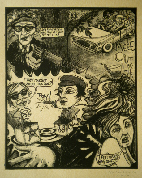 Christine Redfern and Caro Caron are both hard at work here, emersing you into another world–the world of American art and politics of the era. I really appreciate a lot of the imagery here, seeing as I wasn’t around to witness any of these iconic events first-hand. Pages are densely packed with information that isn’t always explained, (faces, sayings, music lyrics, historical venues) and I like being given the space to explore, wonder, and look things up (I will add, to their credit, that Christine and Caro did do a lot of work for the reader: the inside cover of the book is a portrait gallery of “who’s who’s” of the contemporary scene, as well as a glossary in the back).
