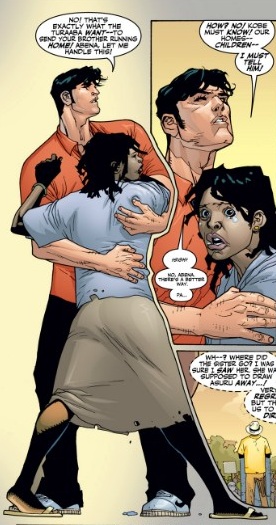 On this note, I can’t help but point out that a summary of this plot line smells a bit of “white man’s burden”. Kent wants to help people who need help the most, so he goes to help a minority tribe in Africa. Some of the images depicting this are particularly noteworthy, like this one to the right, which could also be critiqued from a perspective of gender as well as race. What can I say? It’s hard to write realistic stories without touching real-life issues like politics, gender dynamics, race relations, histories of colonialism and imperialism, etc. Comics have traditionally been comfortable in their own universe[s], but that is slowly, slowly changing, and I think panels like this are an indication of both an attempt to be more real, while also clinging to old stereotypes. (I mean, really, how long has Abena known Kent? Two weeks? If I were her and this guy came out of no-where with mega perception and rock-hard abs, I’d think he was CIA–hands down.)