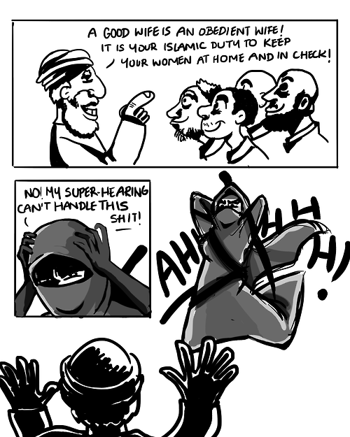 Great initial sketch that I’d reblogged here from artist Deena’s TUMBLR – of a Muslim superheroine. She needs to run with this!