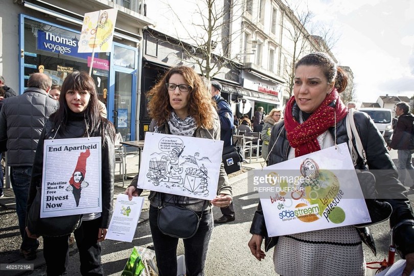 A woman wears a placard reading ‘Bubbles of Sodastream, Tears of Palestinians’ during a demonstration, on January 31, 2015 on the sidelines of the 42nd Angouleme International Comics Festival (Festival international de la bande dessinee d’Angouleme) to protest against the partnership between the comics festival and the Israeli drinks firm SodaStream, in Angouleme, western France. Sodastream, hit by international boycott calls, claims its factory in the Jewish settlement of Mishor Adumim in the occupied West Bank, is a ‘model of integration’ employing 500 Palestinians, 450 Arab Israelis and 350 Israeli Jews on the same salaries and with the same social security benefits. Palestinian employees ‘receive salaries four or five times that of the average wage in the territories controlled by Palestinian authorities’, it has said. Source: Getty Images